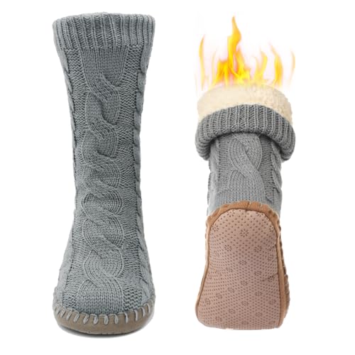 Buy Slipper Socks for Women Grippers, Gray Thick Lined Knit Slipper Sock With Sole Non Skid Bottom, Indoor House Fuzzy Slipper Sock for Hospital Floor, Christmas Slipper Socks for