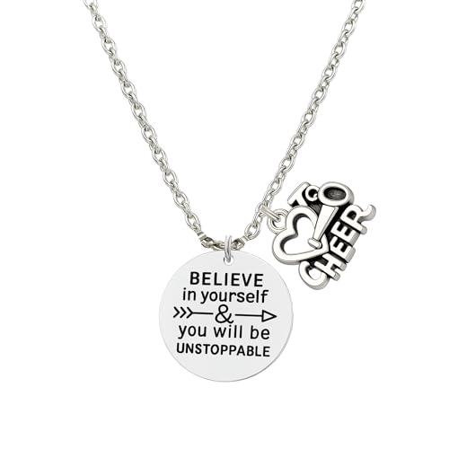 - CHEERLEADING NECKLACE – Beautiful silver plated inspirational Believe in Yourself and You Will Be Unstoppable charm with cheerleader on 18 inch stainless steel chain with 2 inch extension.