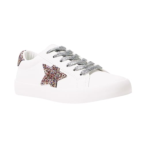 • One-of-a-Kind Style: Our classic sneaker silhouette with multi glitter star, back tab, and silver laces, plus easy care faux-leather.