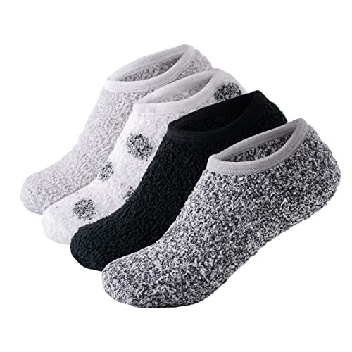 SKOLA 4 Pairs Cozy Winter Fuzzy Women Socks Grip Slippers Fluffy House Non Skid Microfiber Socks(White/Gray/Black/Dark Gray 4 Pairs)