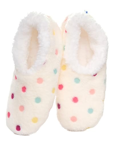 - SNOOZIES SLIPPER SOCKS – Lotsa Dots colorful art design on each slipper that are lined with a soft Sherpa fleece inside.